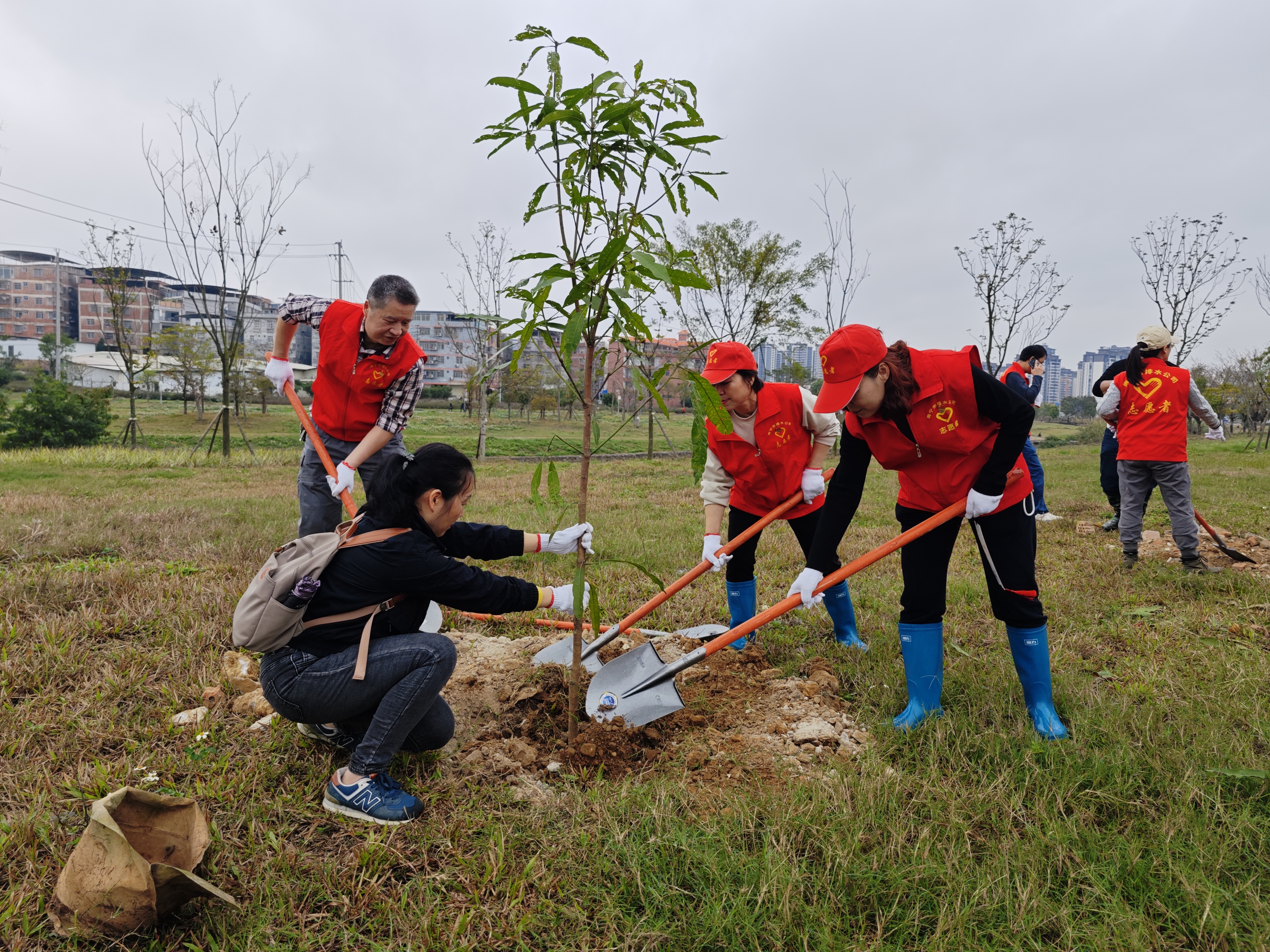 活動現(xiàn)場,綠化養(yǎng)護(hù)人員向大家講解種植樹苗的注意事項(xiàng)和技巧,志愿者們圍攏聆聽,記錄關(guān)鍵步驟。學(xué)習(xí)結(jié)束后,志愿者們迅速分組,領(lǐng)取樹苗、鐵鍬、水桶等工具,開啟“實(shí)戰(zhàn)”模式。大家分工明確,有的扶苗培土,有的提水澆灌,配合默契,現(xiàn)場一片熱火朝天景象。新栽的樹苗錯落有致、迎風(fēng)挺立,為初春的朝陽溪增添勃勃生機(jī)。