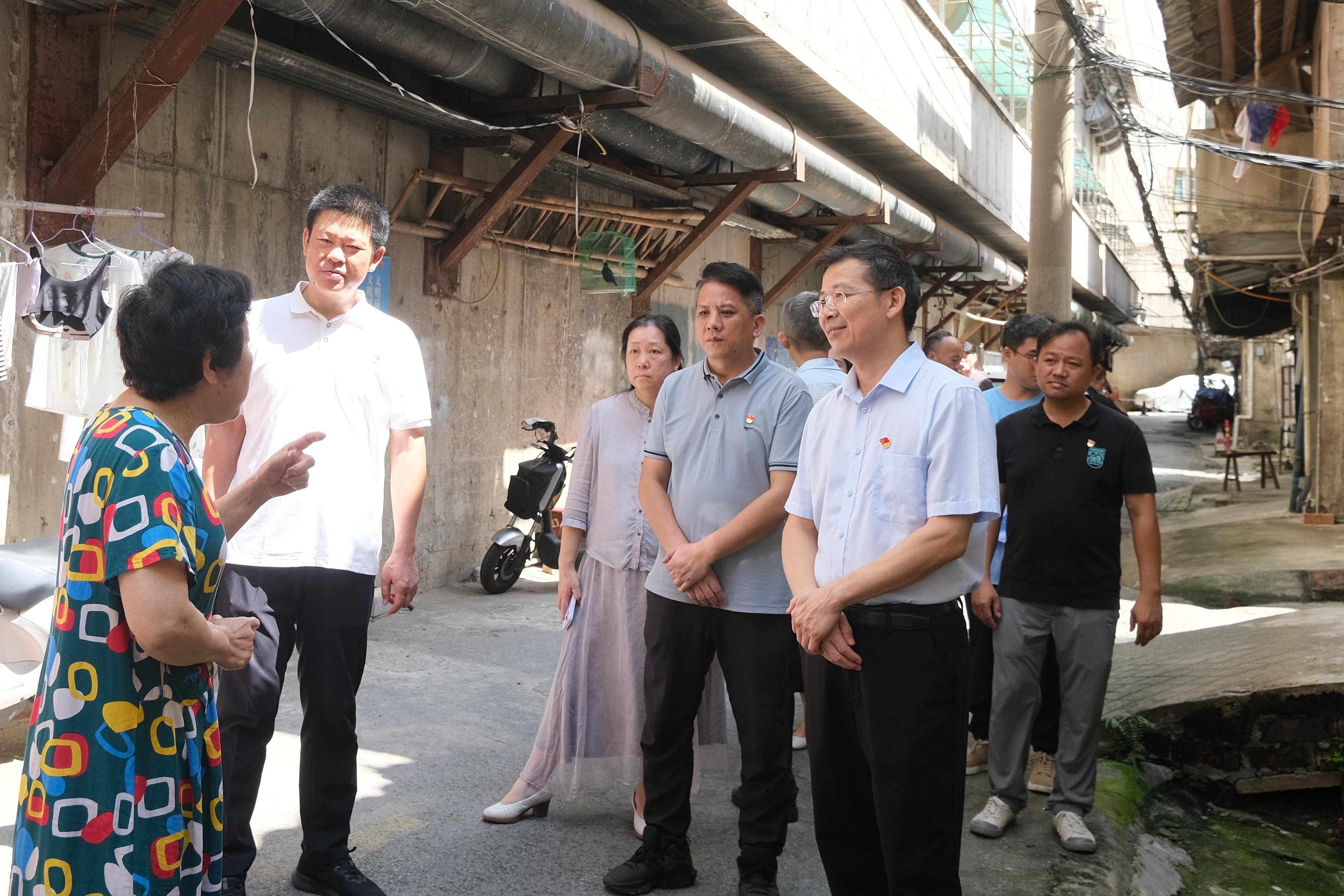 南寧市住建局機(jī)關(guān)第六黨支部書記、公用事業(yè)三科科長徐修平(左二)、南寧建寧水務(wù)集團(tuán)黨委委員、副總經(jīng)理周柏建(左五),南寧市排水有限責(zé)任公司第一黨支部書記、副總經(jīng)理韋雄飛(左四)到中山東二里與社區(qū)居民進(jìn)行交流